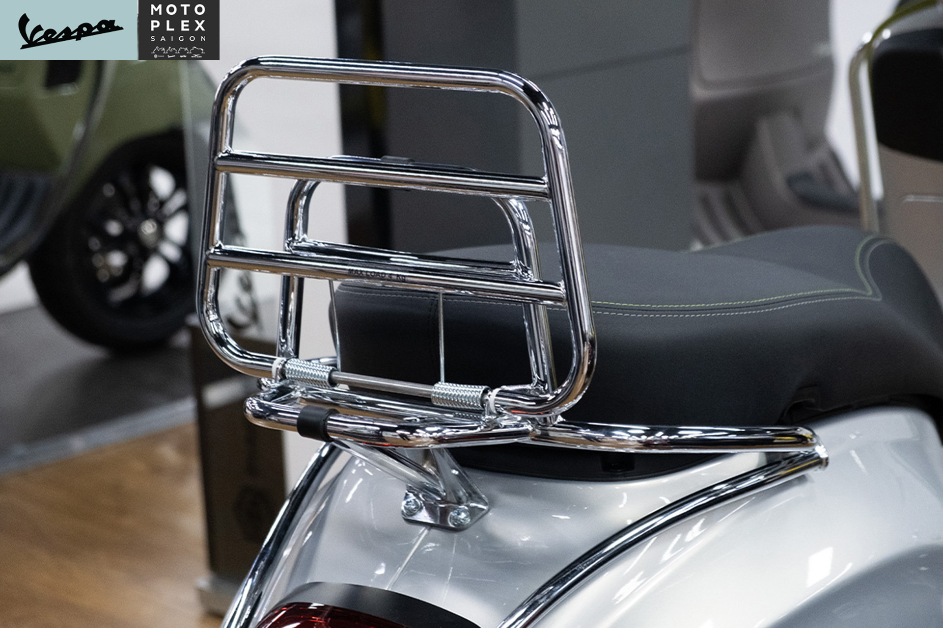 Baga sau màu chrome được thiết kế có thể gập lại linh hoạt, giúp chiếc xe luôn giữ được dáng vẻ thanh thoát. Khi cần chở đồ, baga mở ra chắc chắn, tiện dụng. Khi không sử dụng, chỉ cần gập xuống, phần đuôi xe trở lại vẻ đẹp nguyên bản tinh tế, gọn gàng và rất Vespa.