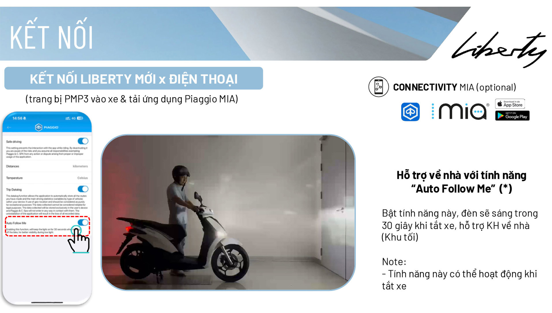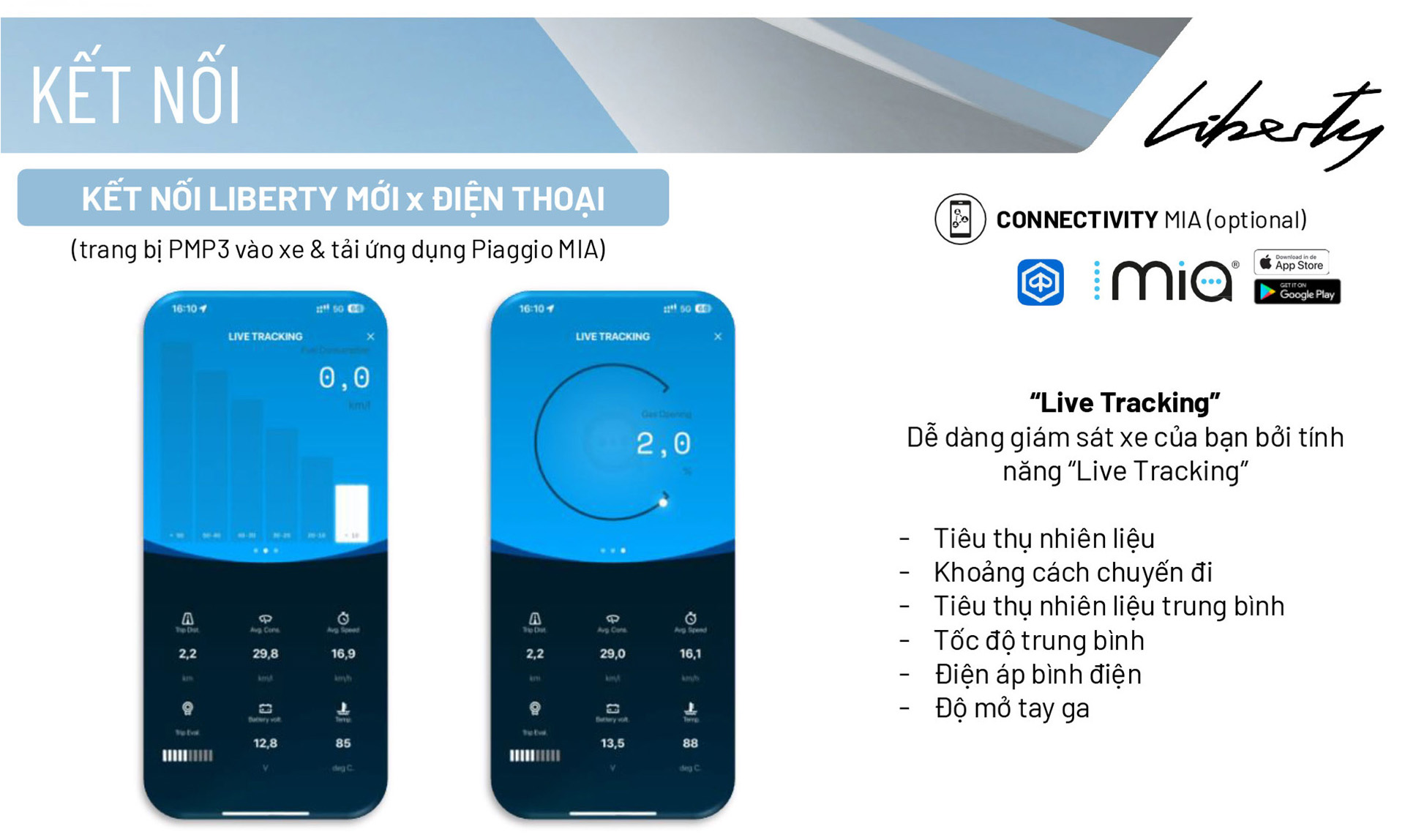 Liberty S không chỉ là một phương tiện mà còn là người bạn đồng hành thông minh nhờ hệ thống Piaggio MIA, kết nối Bluetooth giúp hiển thị thông báo cuộc gọi, tin nhắn và điều khiển nhạc ngay trên màn hình LCD hiện đại của xe.