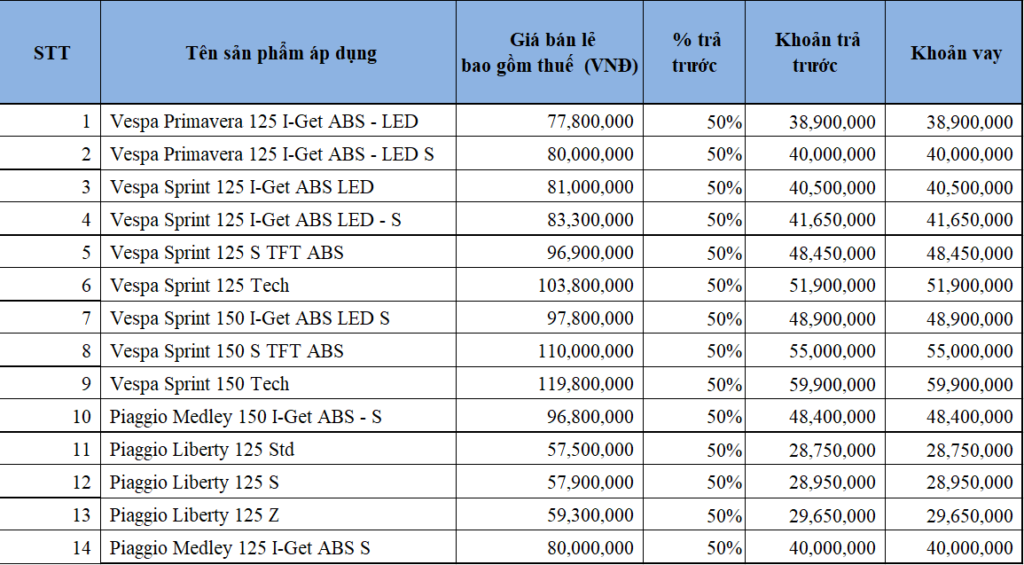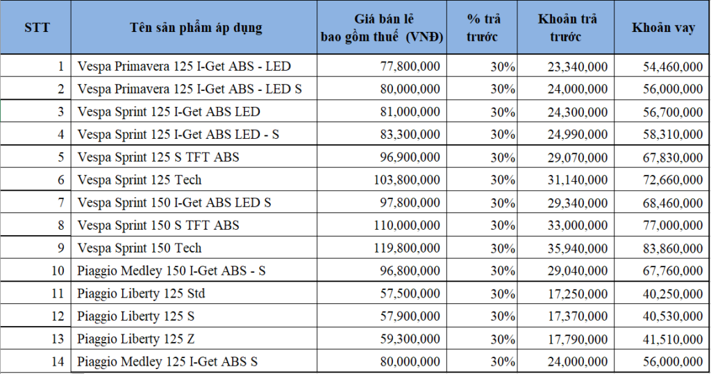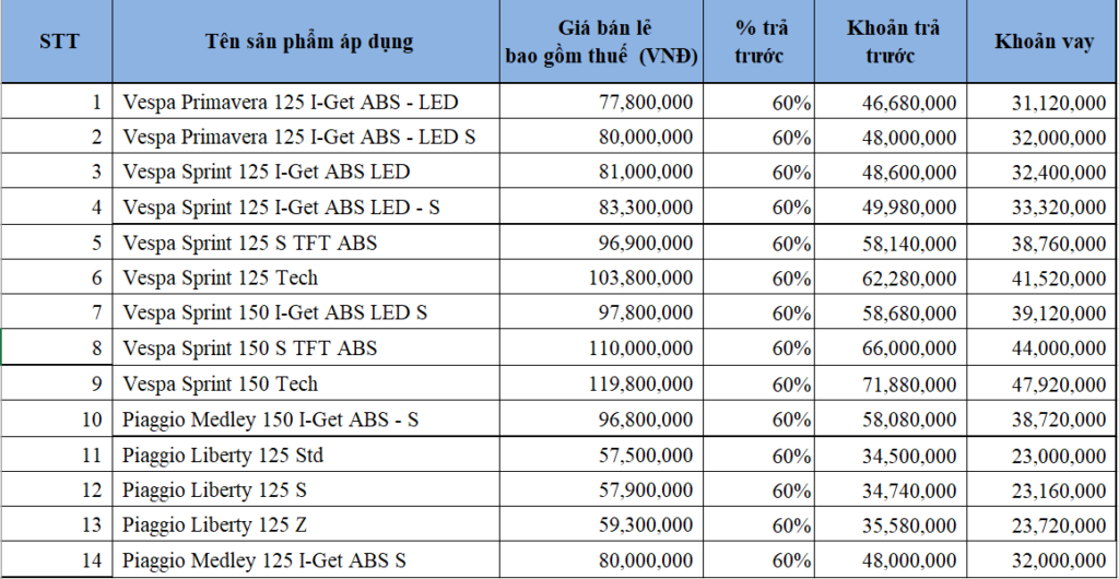 5/ Các mức trả trước khi mua xe Vespa/Piaggio.