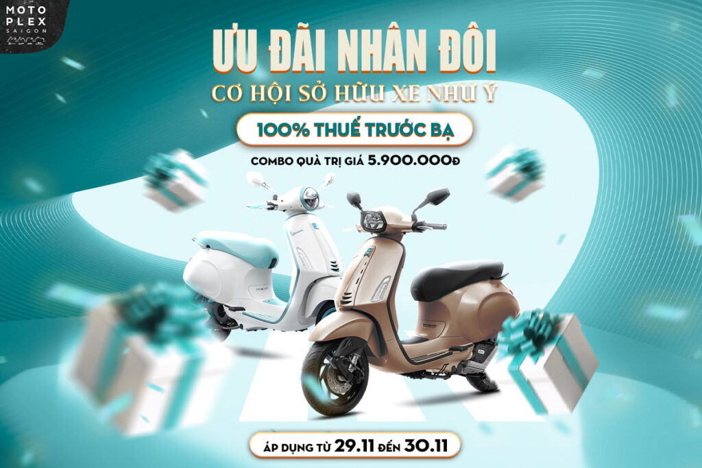 Nhận ưu đãi vàng với duy nhất 2 ngày 29.11.2025 và 30.11.2025 với cơ hội nhận ưu đãi lớn khi mua xe, đặc biệt ưu đãi lớn nhất với xe Vespa Spint (125/150cc) 2025, Vespa Primavera 2025, Piaggio Liberty 2025 khi mua tại Trung Tâm Motoplex Sài Gòn. TẶNG 100% THUẾ TRƯỚC BẠ, cùng Combo quà tặng chính hãng trị giá lên đến 5Tr 900, Tặng BỘ MIA(Kết nối Smartphone) trị giá 3Tr500 cho xe Sprint/Primavera 2025, Liberty 2025.